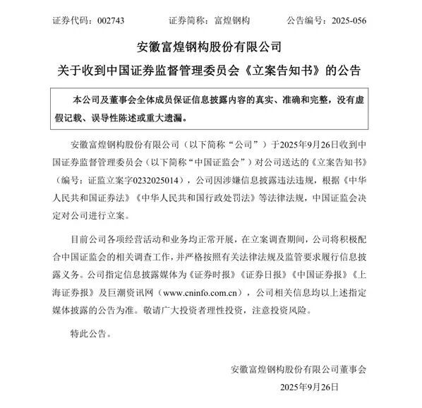 9月26日晚间,富煌钢构(002743)披露公告称,公司于当日收到证监会对公司送达的《立案告知书》聚宝盆,公司因涉嫌信息披露违法违规,证监会决定对公司进行立案。