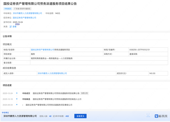 时隔四个多月,企查查显示:国证资管在今年12月18日公示中标候选人——深圳市鹏劳人力资源管理有限公司(简称:鹏劳人力);12月24日“中标成交”。但天眼查目前未见更新。